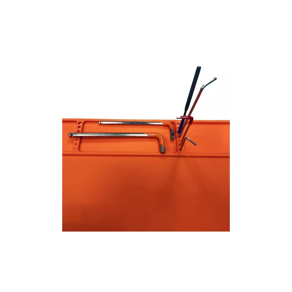 Una serie di piccoli fori sul bordo superiore del tappetino fornisce un comodo mezzo per contenere chiavi a brugola o spilli.