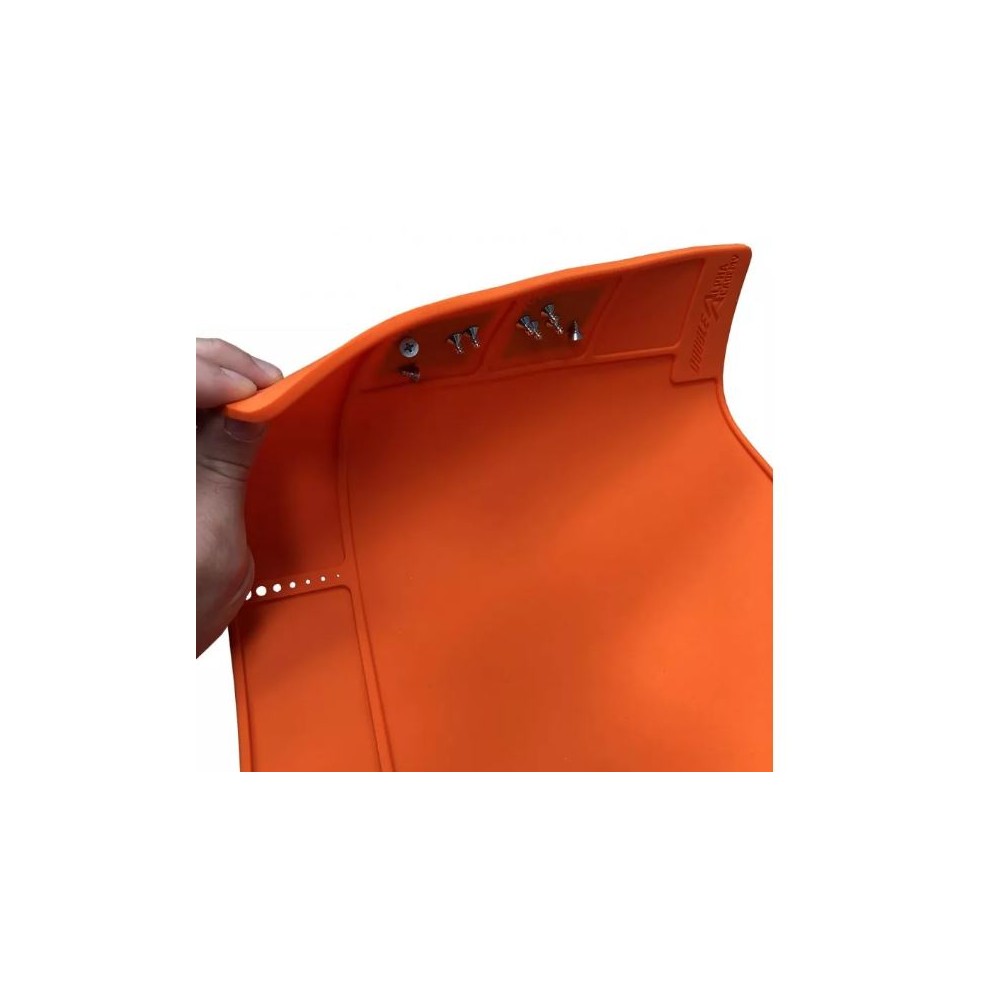Una fila di tasche dentellate si estende sul lato superiore e destro del tappetino da lavoro e fornisce una posizione comoda per posizionare le piccole parti da smontare. Due delle tasche sul lato destro sono dotate di cuscinetti magnetici installati, per tenere meglio in posizione piccole viti o punte, impedendo che si muovano o si perdano. Un bordo rialzato tutto intorno al bordo del tappetino assicura che le piccole parti non rotolino via e che i liquidi detergenti applicati non fuoriescano dal tappetino e sul piano del tavolo.