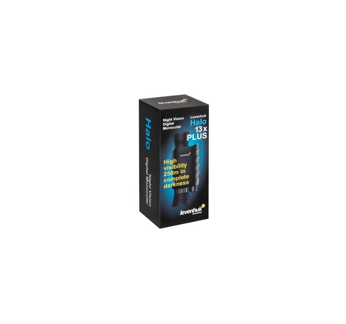 Il Levenhuk Halo 13X PLUS consente di effettuare osservazioni a qualsiasi distanza durante il giorno e fino a 250 m di notte. Uno dei principali vantaggi è la sua distanza minima di messa a fuoco. Con questo strumento, infatti, è possibile mettere a fuoco nitidamente un oggetto distante soli 0,5 m. Ciò si rivela utile per controllare una mappa di notte mentre si è alla guida, oppure per osservare oggetti d’interesse a breve distanza. L’illuminazione a infrarossi (IR) del dispositivo è dotata di 7 livelli di luminosità per un’ottima esperienza di osservazione in tutte le condizioni di luce. Le ottiche sono realizzate in vetro fully-coated con rivestimento al biossido di silicio e offrono immagini luminose, nitide e ricche di contrasto, capaci di catturare ogni dettaglio. Si tenga presente che lo strumento può riprodurre un’immagine a colori, in bianco e nero, in verde fluo o con effetto negativo. Tuttavia, l’immagine a colori non è disponibile quando è attiva la modalità notte.